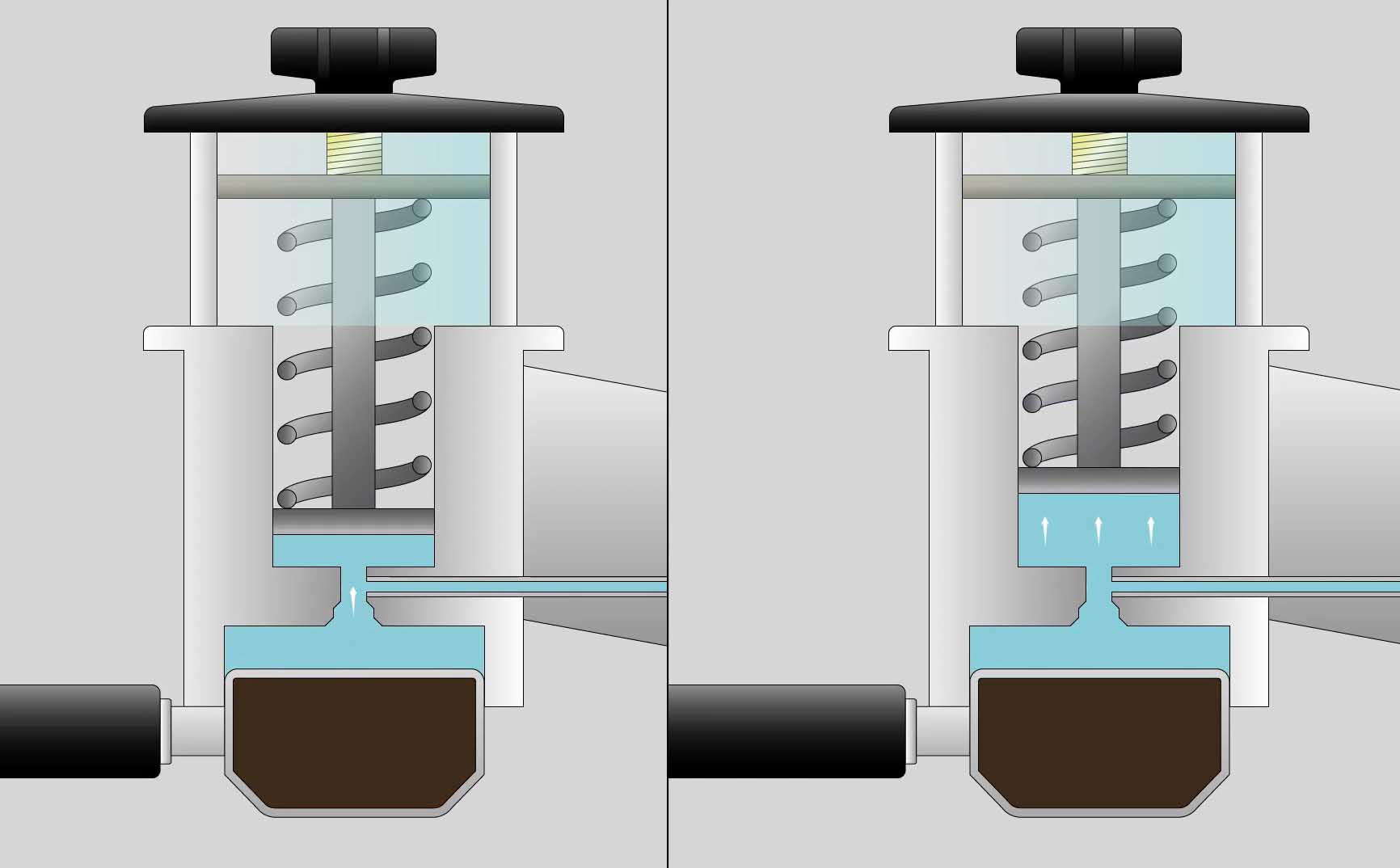 Ở máy pha cafe thông thường, nước nóng khi tràn vào buồng ủ chỉ có duy nhất một đường thoát ra qua bánh cafe với áp suất đầy 9bar. Nhưng ở máy KVDW Spirit, nhờ piston idro-matic, áp bơm vào đủ để đẩy lò xo đi lên, mở rộng thể tích buồng ủ (như hình bên trên) . Nói cách khác, piston kia đã làm giảm áp suất lên bánh, chính xác hơn là áp suất lên bánh cafe được tăng dần từ 0 cho đến khi đủ 9bar (khi lò xo không còn bị nước đẩy lên cao nữa).