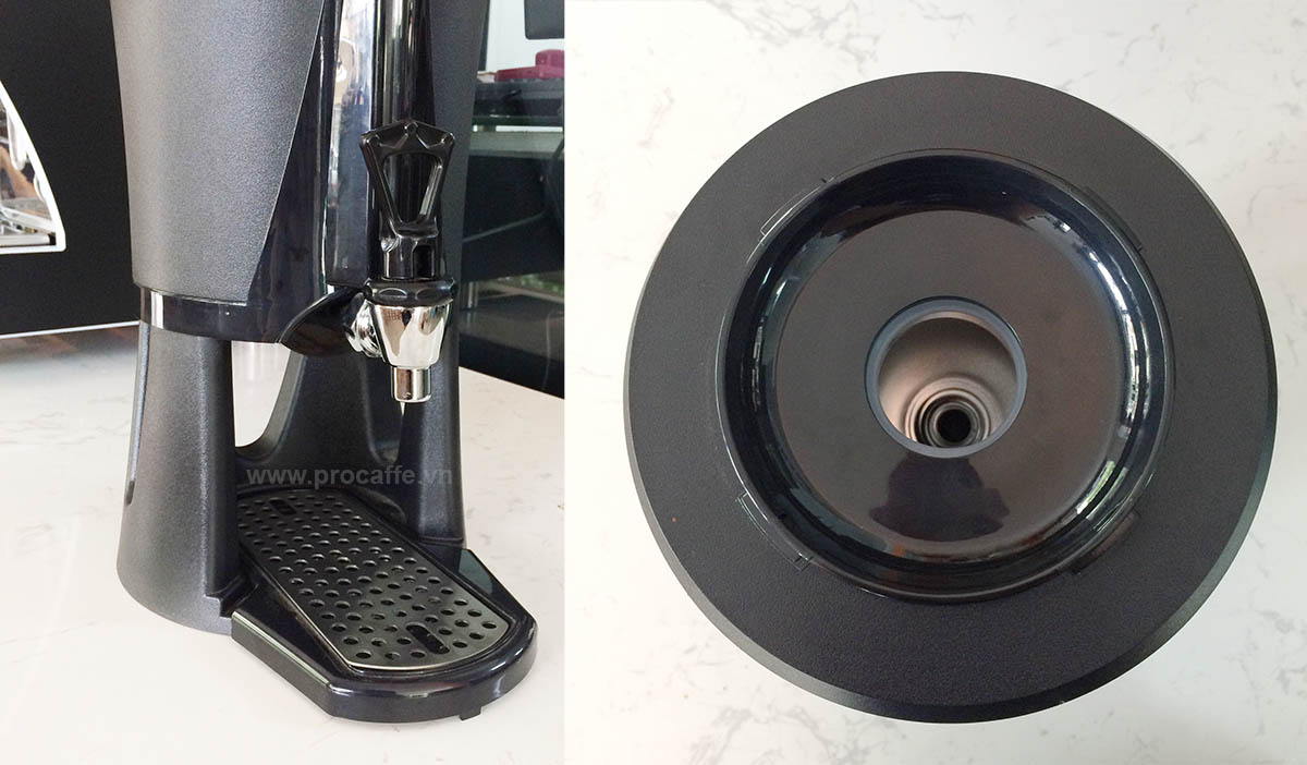 Khác với phiên bản Coffee Queen Thermos có bình chứa khép kín, Mega Gold còn có vòi lấy cà phê ngay phía trước bình chứa. Bên dưới là khay nước thải có độ cao cách vòi chiết xuất 10cm (ngang 12cm), phù hợp với nhiều kích cỡ ly tách khác nhau.