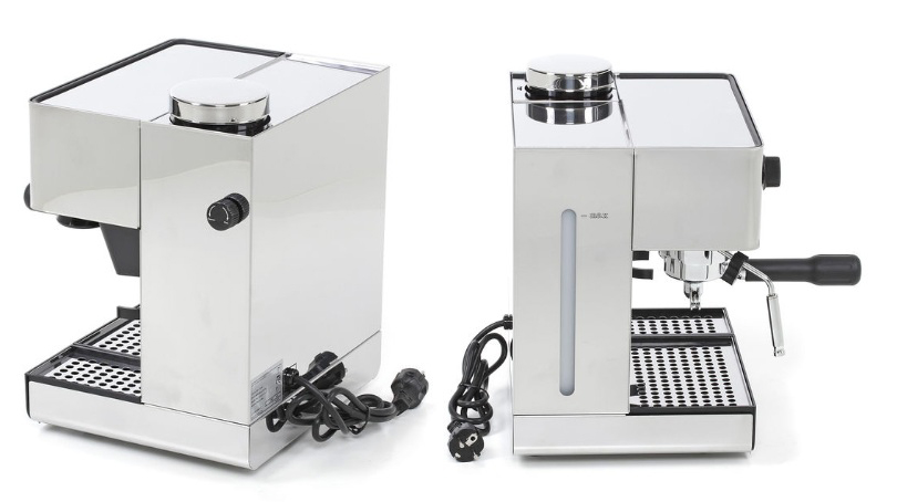 Vỏ máy hoàn toàn từ thép không gỉ sáng bóng, vừa sang vừa dễ vệ sinh, lâu hư cũ. Máy có 2 núm vặn, 1 để điều chỉnh độ mịn cối xay, còn lại để điều chỉnh vòi đánh hơi, rất tiện. Máy chỉ có 3 nút điều khiển tương ứng 3 chức năng làm cà phê, steam và khởi động/tắt máy. Các bước sử dụng này đều được bố trí trực quan, tiện lợi.