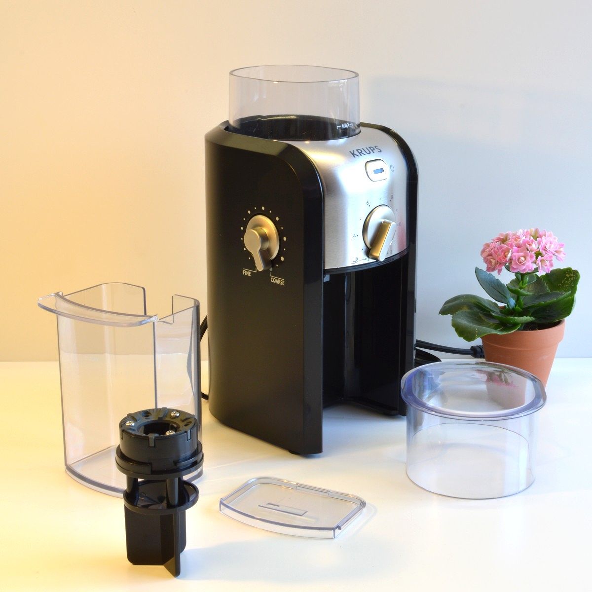 Máy xay cà phê Krups có công suất 100W, ngăn chứa hạt dung tích 225 gram đủ xay liên tục để làm ra 12 tách cà phê cho cả gia đình hoặc nhu cầu dùng trong ngày. Máy có lưỡi dao kép hình nón xay nhanh và đều, giảm được hiện tượng quá nhiệt và có thể tháo rời bánh răng để vệ sinh. Chất lượng kích thước phân tử bột cà phê đồng đều giúp hơi nước thẩm thấu đều chiết xuất hết tinh chất, mang đến tách cà phê ngon hơn.