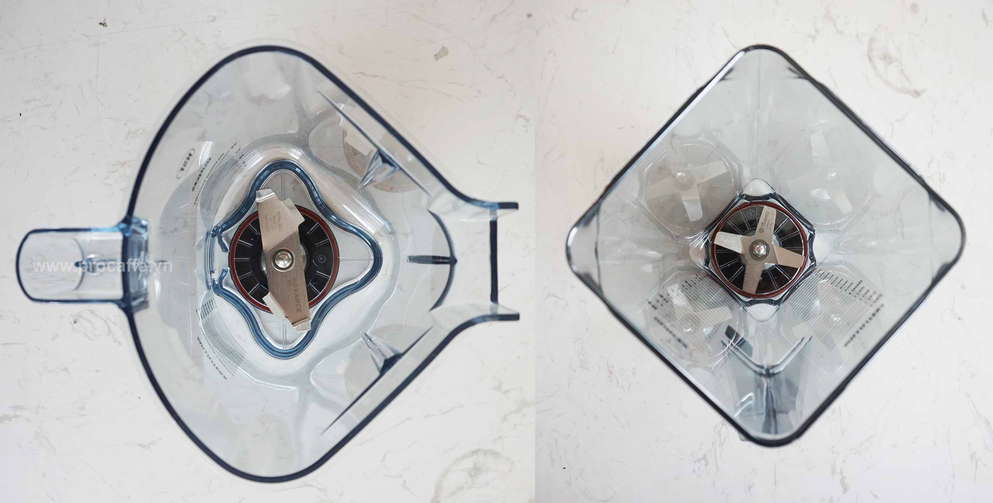 Nhìn hình bên trên, có thể thấy dao xay của Drink Machine Advance bản to hơn 2 speed. Thép dày cứng, to bản cắt đá nhanh và hiệu quả hơn. Thời gian xay được cải thiện, dao xay ít bị hao mòn.