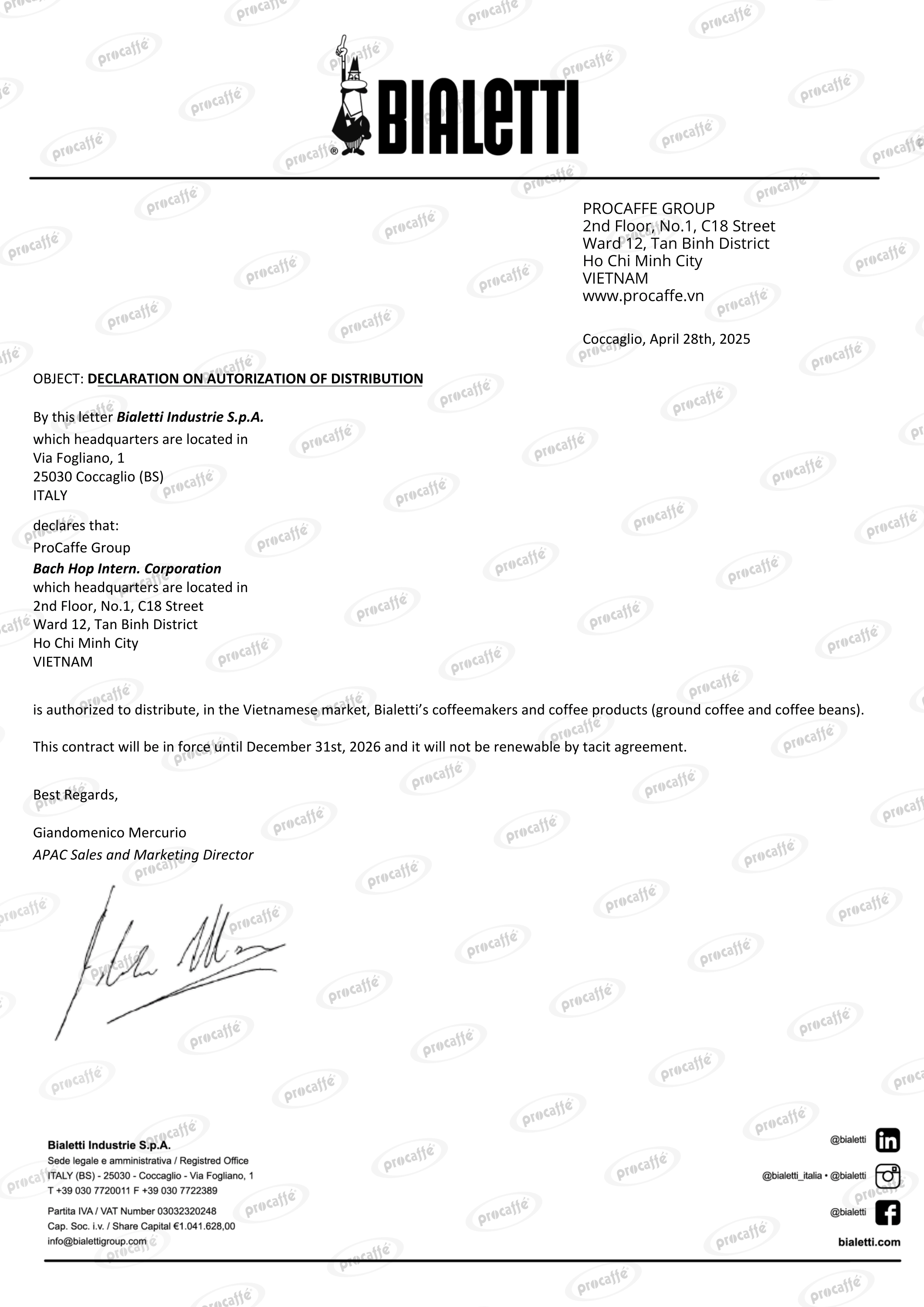 ProCaffe Group tiếp tục khẳng định vị thế đối tác chiến lược của Bialetti tại Việt Nam, và là cầu nối đồng hành mang tinh thần đậm chất Ý đến với người Việt qua từng tách cà phê hằng ngày.