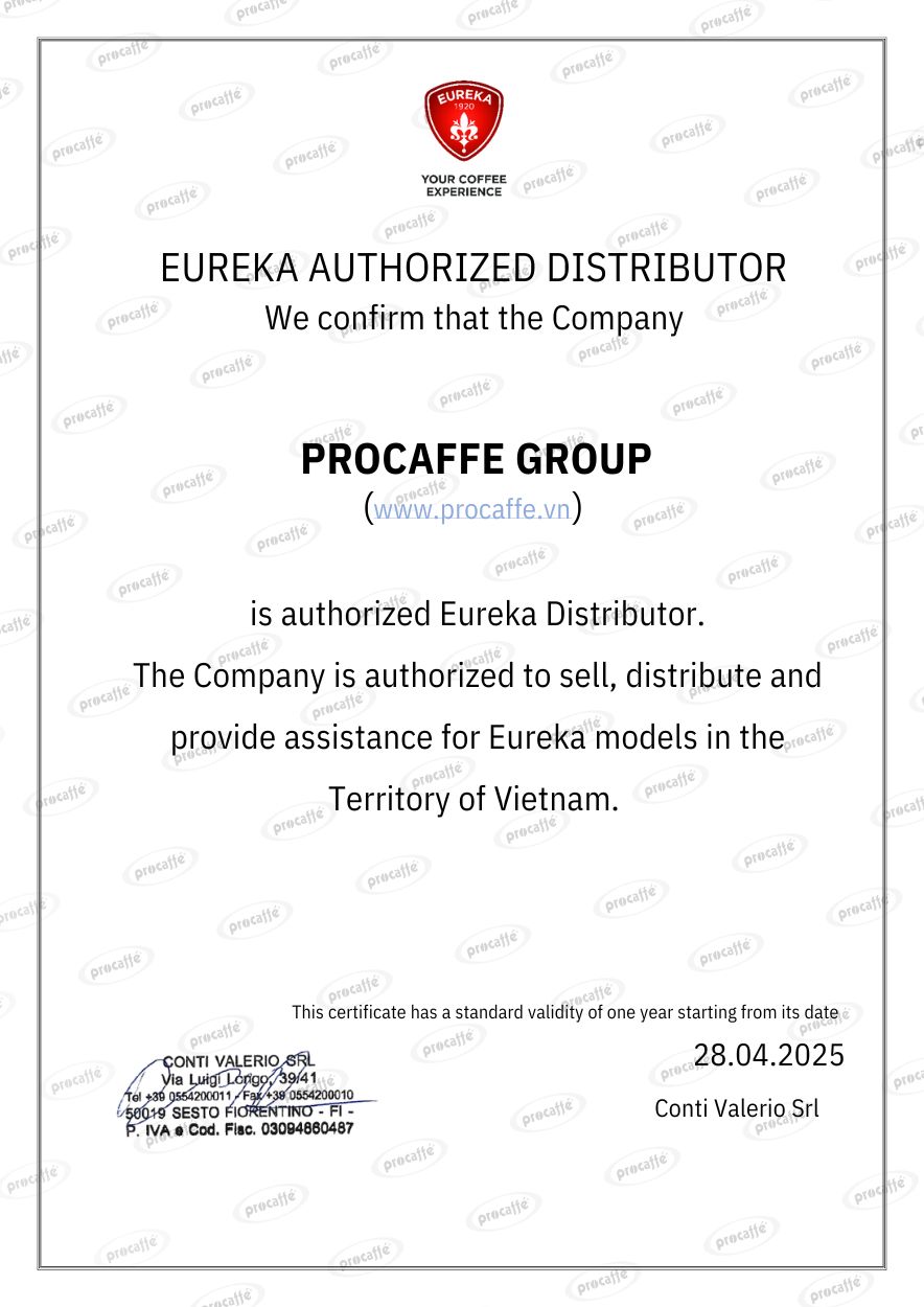 Theo chứng nhận được cấp bởi Conti Valerio Srl – nhà sản xuất chính thức của Eureka, ProCaffe Group đã được ủy quyền: