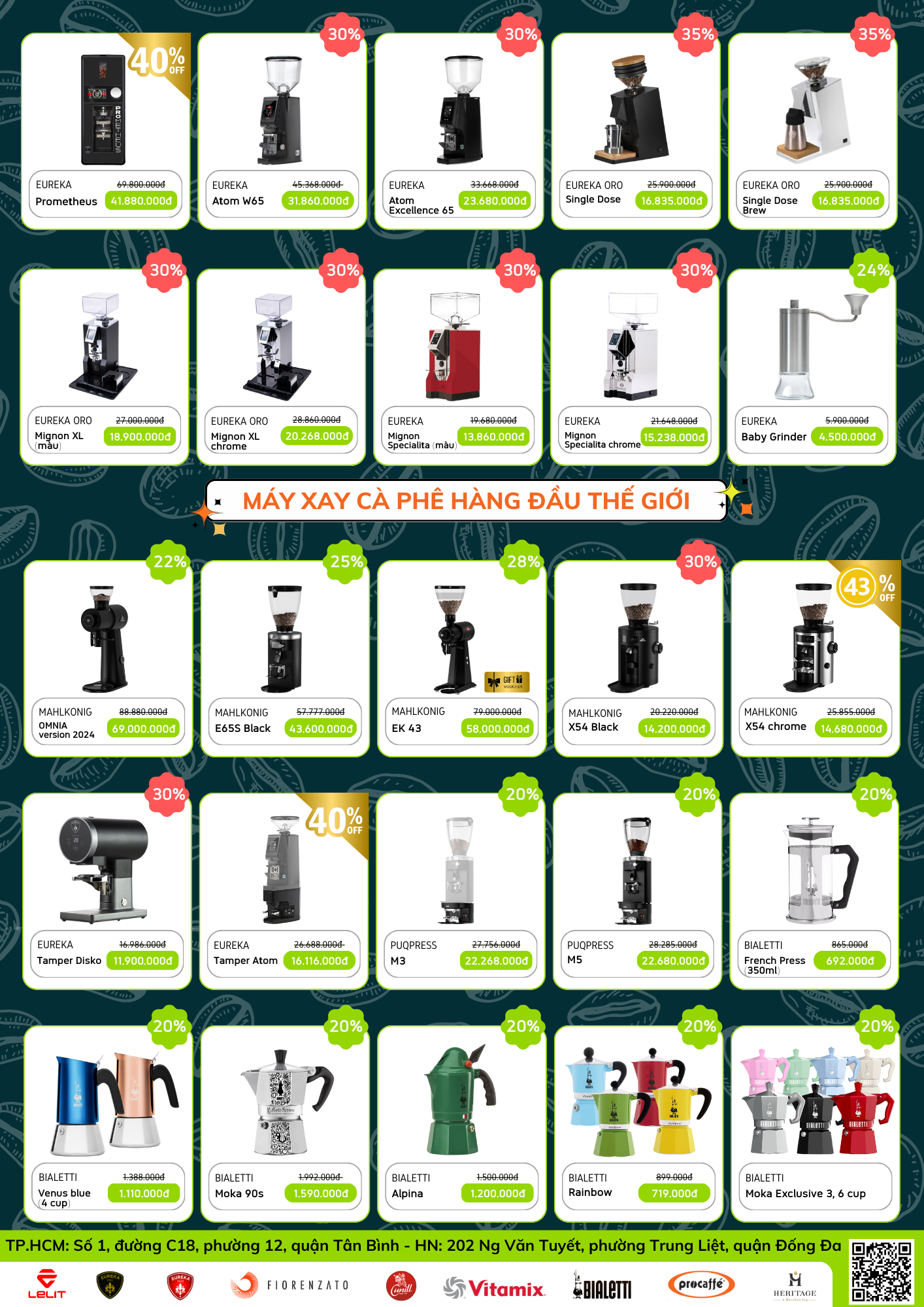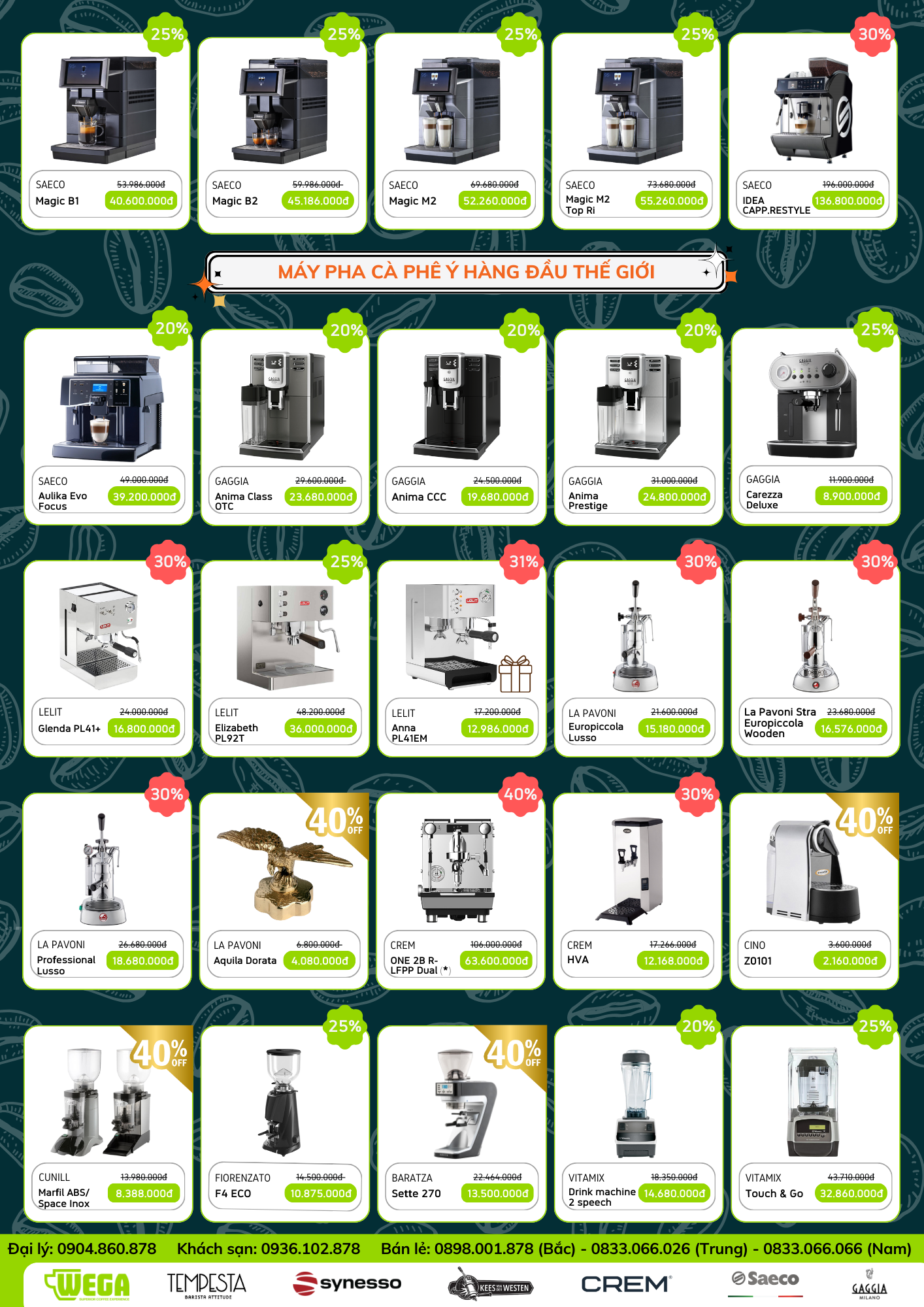 Đây là cơ hội vàng để bạn sở hữu những thiết bị chất lượng quốc tế với mức chi phí tối ưu – đặc biệt phù hợp với những ai đang có ý định mở quán cà phê, nâng cấp máy móc hoặc đơn giản là muốn nâng tầm trải nghiệm cà phê tại nhà.
