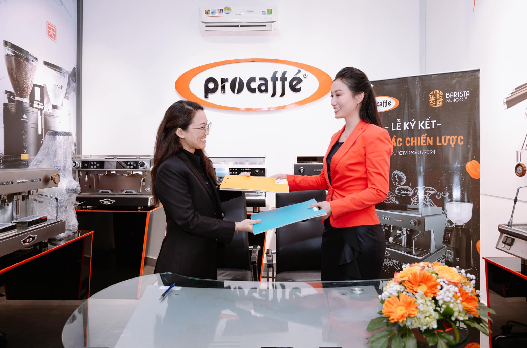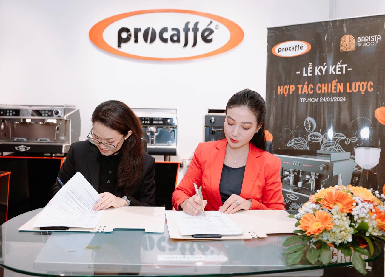 Ngày 24.01.2024 vừa qua, chị Nguyễn Huỳnh Kim Ngọc – CEO & Co-Founder, hiệu trưởng của Barista School (BS) và chị Hoa Tina – CEO & Co-Founder của ProCaffe Group đã ký kết thỏa thuận hợp tác chiến lược.