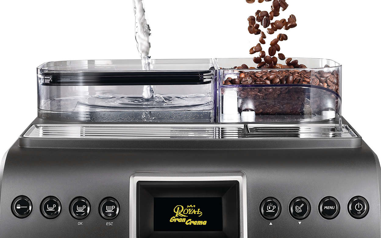 Saeco Royal Gran Crema có thể cung cấp bọt sữa mịn mượt, nước nóng và hơi nước. Máy tự động làm các đồ uống liên quan đến cà phê và có nền sữa như cappuccino hay latte macchiato. Tất cả là nhờ bộ đánh sữa thông minh độc quyền Tuono. Việc thưởng thức thức uống nguyên kem không còn là điều khó khăn nữa.